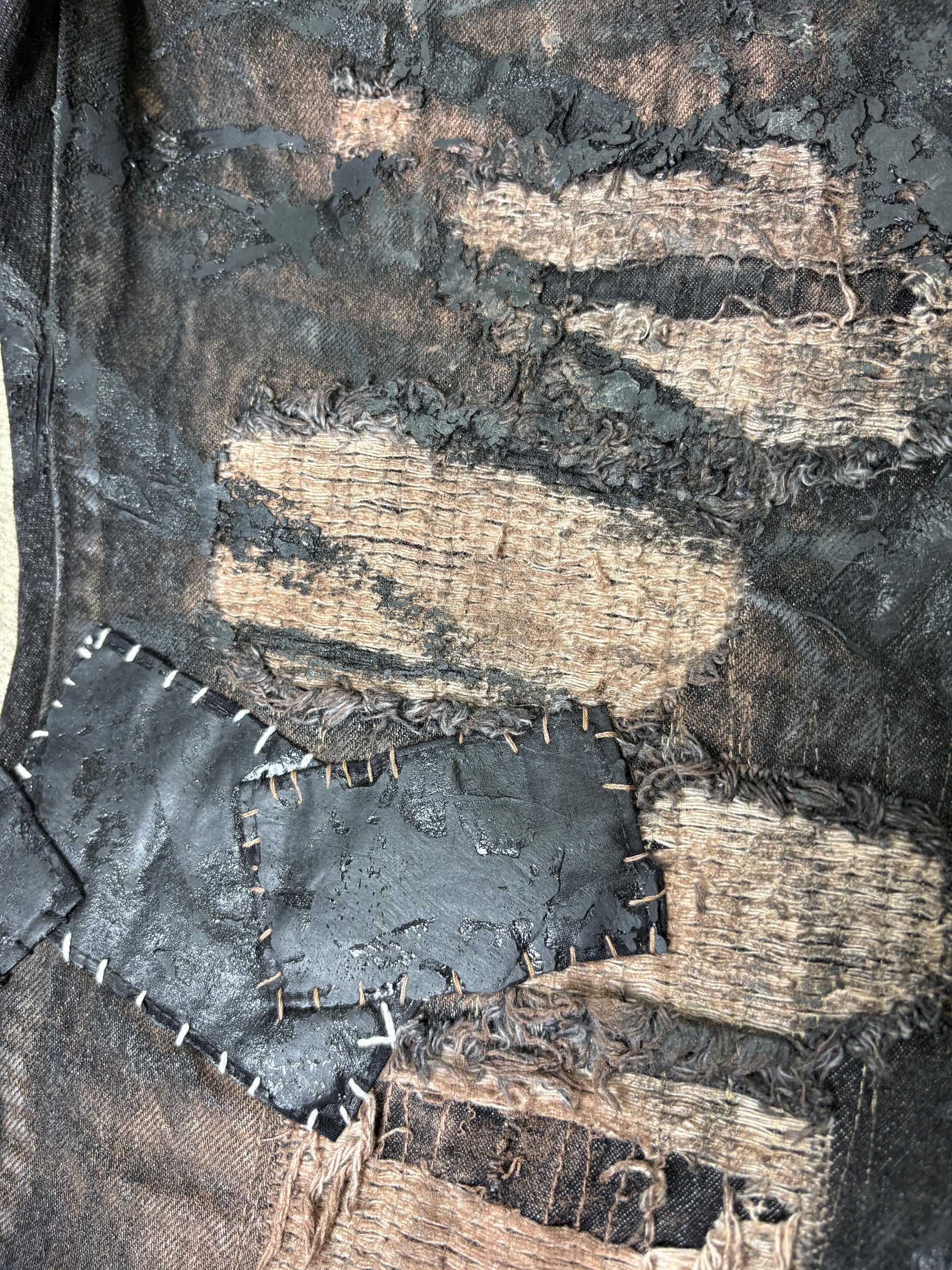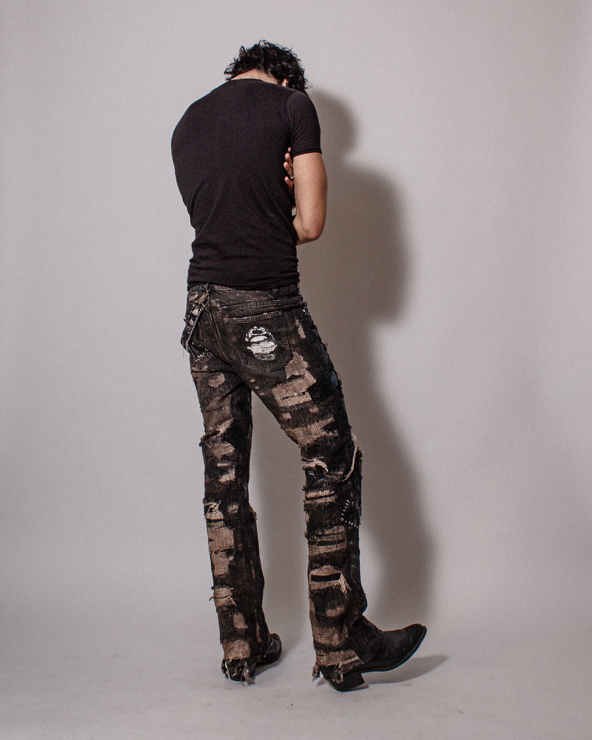 Heavily distressed denim featuring patchwork repair throughout the front and back of the base garment. Hand painted with reflective wax coating giving a textured look and feel. Featuring contrast whip stitch patchwork and pyramid studded pocket detail. These jeans featuring a double button closure and a denim belt chain attached at the belt loops.