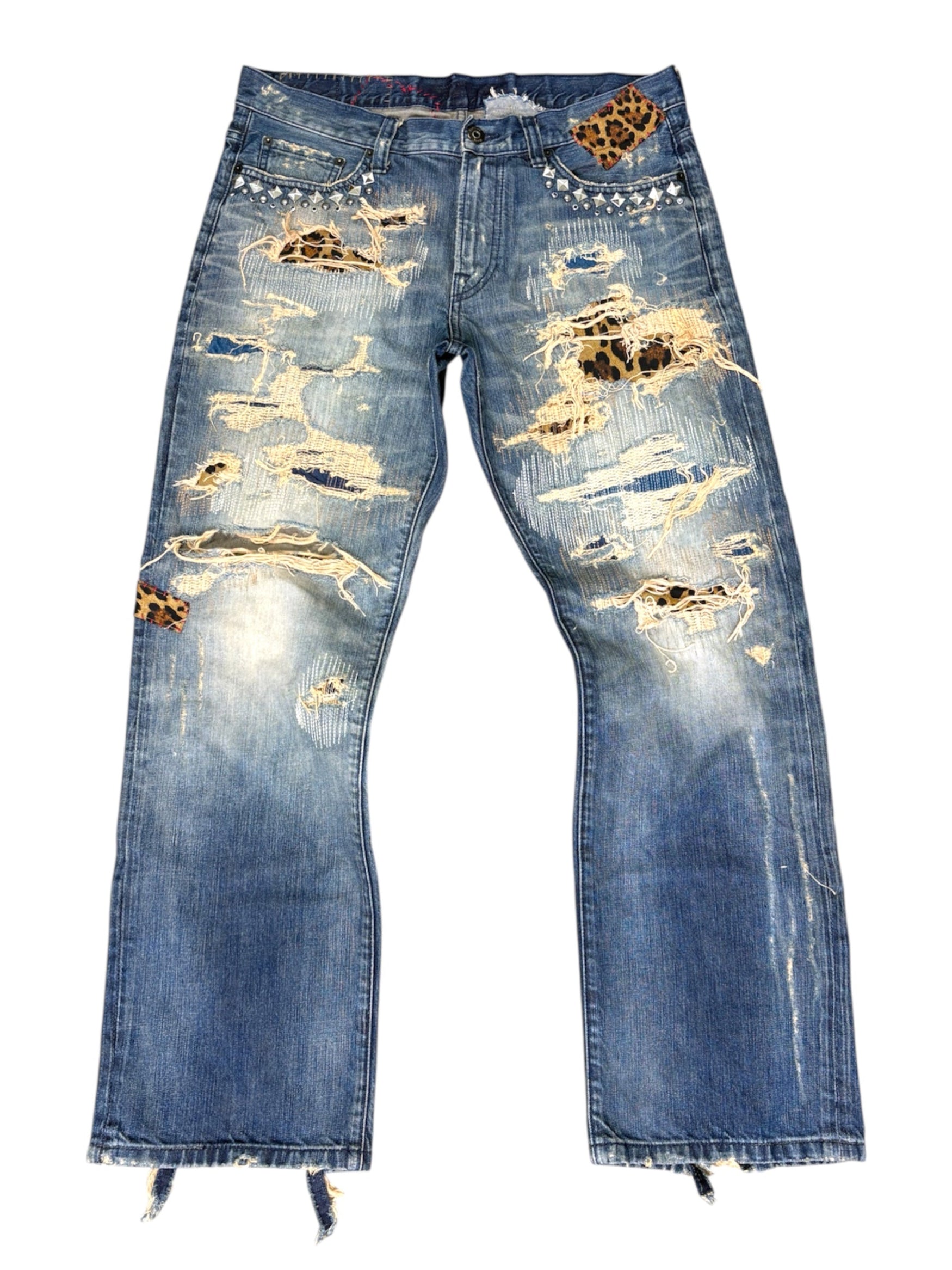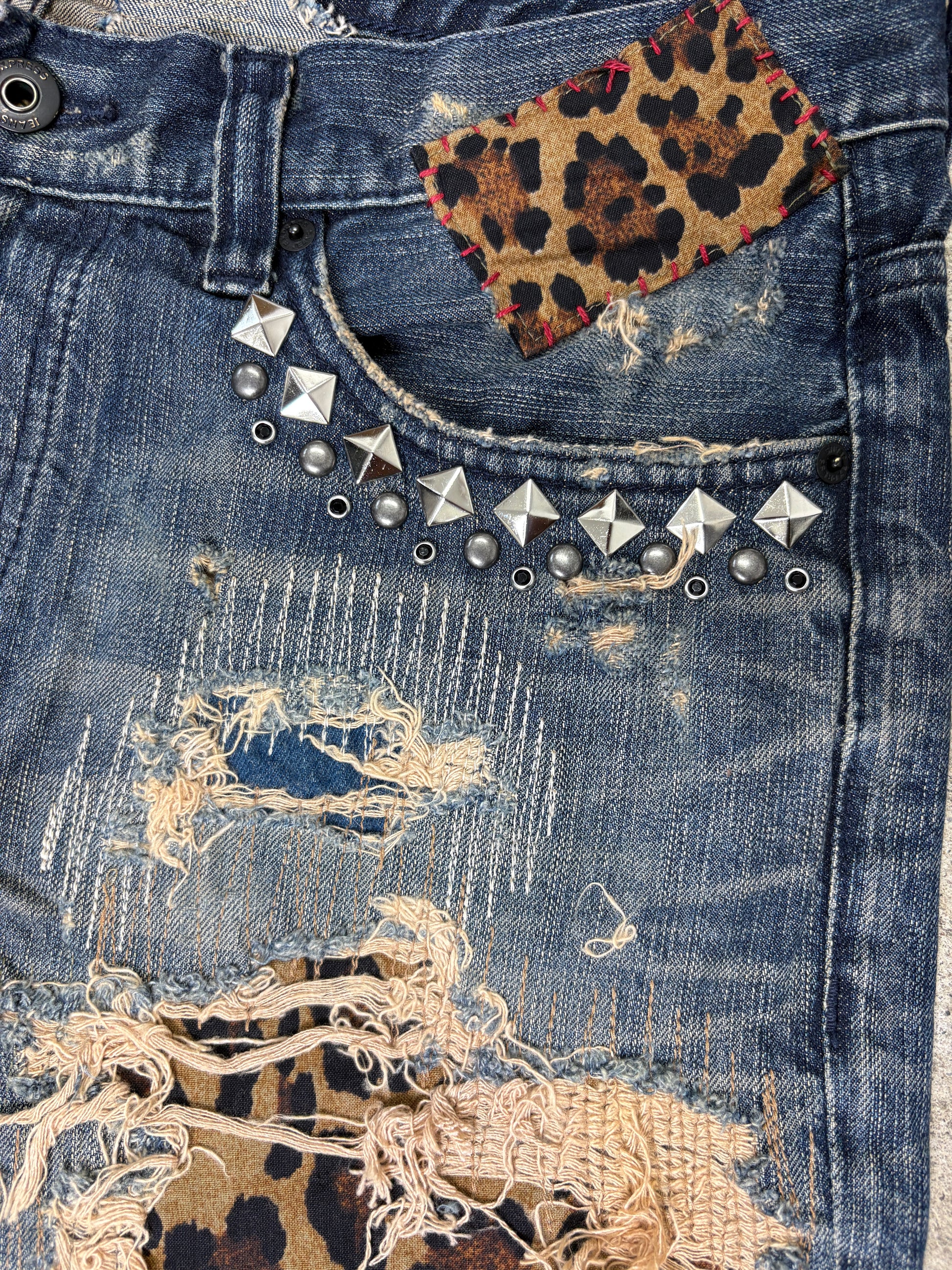 Reworked Vintage 2000's Era Denim. Distressed and Repaired with multi tone leopard animal print patchwork. Hand Studded Pocket Hardware Detail.